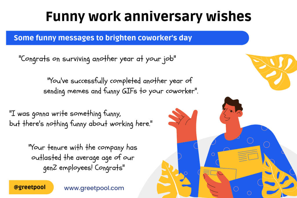 Congratulating colleagues on their journey of success doesn’t have to be all formal and superficial. Throw in some humor and put a smile on their face to make your message stand out. Check out these funny work anniversary card wishes:
