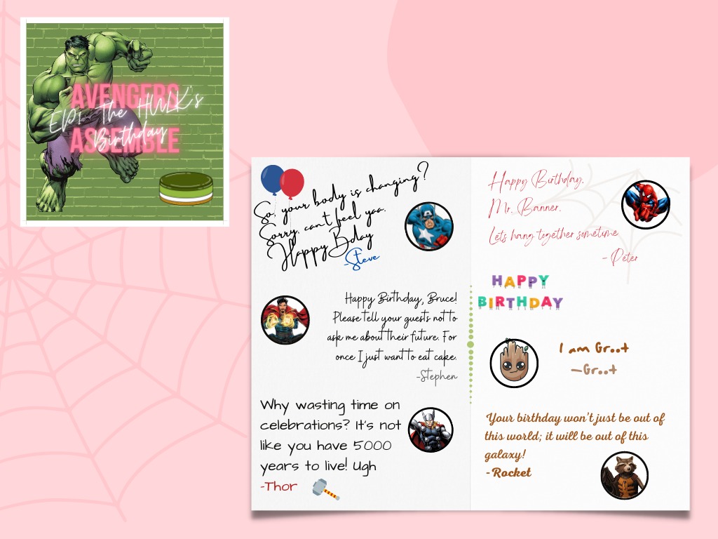 If you are sending the virtual birthday card on their actual birthday day then choose a theme that is based on their favorite fictional characters, movies, series, and so on. For example, the recipient is someone who is a crazy Marvel movies fan. Everyone contributing to the card can choose a Marvel character of their choice and write the recipient a personal message (birthday wish) as that Marvel character would write it.