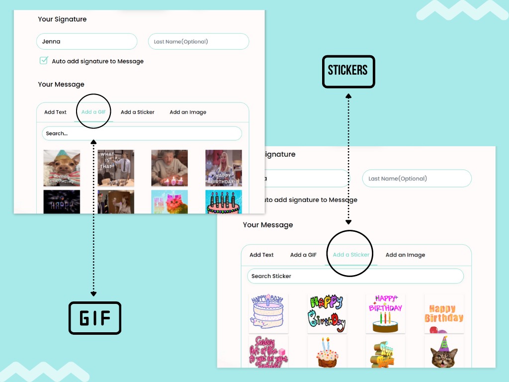 Adding animated elements, such as GIFs or stickers, will make the birthday group card so much merrier. You may use them to augment the theme of your card, for example using GIFs from The Office TV show, or GIFs from Avengers, etc. Use stickers to add the adorable element to the card and make your wonderful person (the receiver of the card) smile wide on their special day. Stickers to convey birthday hugs, cake, a heartfelt message and so many more options are available at GreetPool.